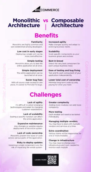 To help you evaluate which ecommerce structure is best for your business, we’ve compiled a list of the top benefits and challenges of composable and monolithic solutions.