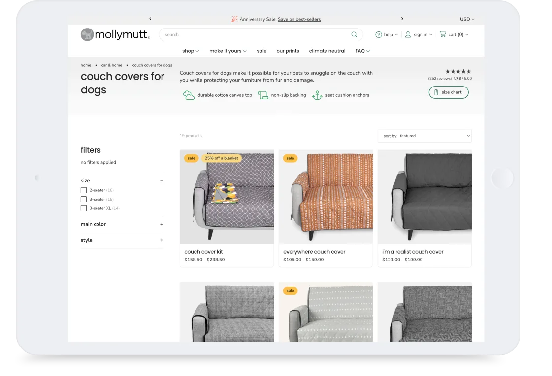 A key factor in Molly Mutt’s decision to choose BigCommerce was the native functionality and easy-to-install apps the platform offers. Molly Mutt wanted the power to scale their business through BigCommerce’s native features such as faceted search, otherwise known as advanced product filtering.