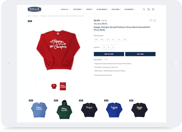 Although the integrations provided by BigCommerce and Channel Advisor allow for selling on the marketplaces and social channels themselves, there has been a focus on guiding potential customers to finish a purchase on the website. “When you buy from a social media platform or marketplace, something a customer sees randomly in an ad, you’re not buying something from B-Wear; you’re buying it from Facebook or Amazon or wherever else,” McCune explained. “It’s a lot harder for us to build a relationship with the customer that way.”