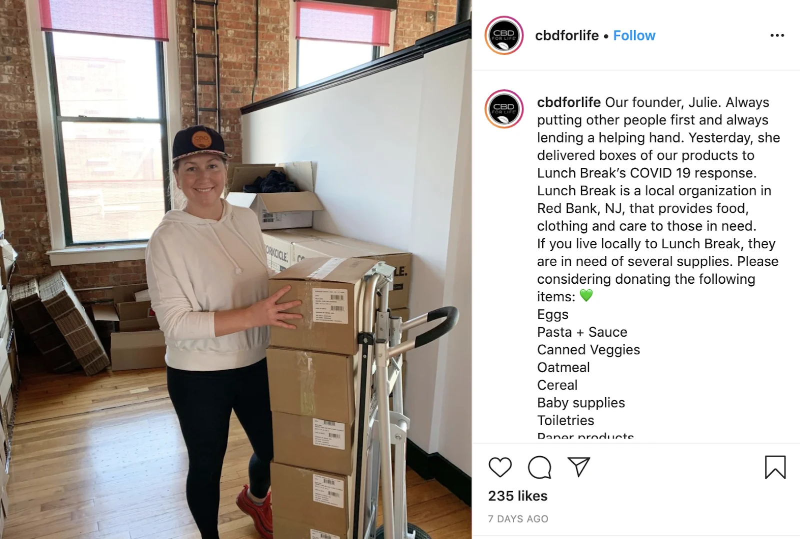 CBD brand CBD for Life demonstrates how they do this with their blog content. They provide informative, but also timely, updates to help connect with customers and foster relationships. For example, during the COVID-19 pandemic when many people were abiding by Shelter in Place policies, they provided a blog post on how their products can be used during these specific times. They also shared content on Instagram showcasing how their brand is helping.